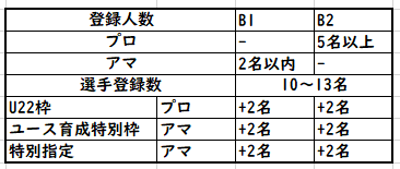B1はアマ契約2名以内、B2はプロ契約5名以上。ただし特別指定選手とユース育成特別枠選手はアマチュア選手の登録条件数を適用しない。(そもそも登録人数が別枠のため)