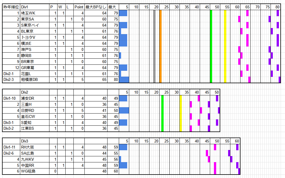 Div1、2の黄色ラインは、昨年のPO進出、順位決定戦の上位側の最低勝ち点。緑色ラインは、PO進出を逃した、順位決定戦の下位側の最高勝ち点。