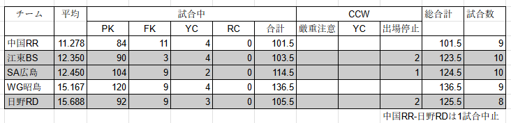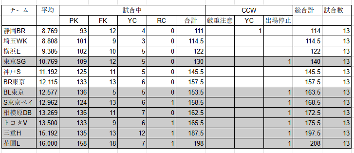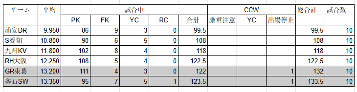 平均反則ポイントは、昨シーズンDiv1は10.7~16.4なので多い方はさほど変化はない。少ないチームがより増えたといってよいか。
