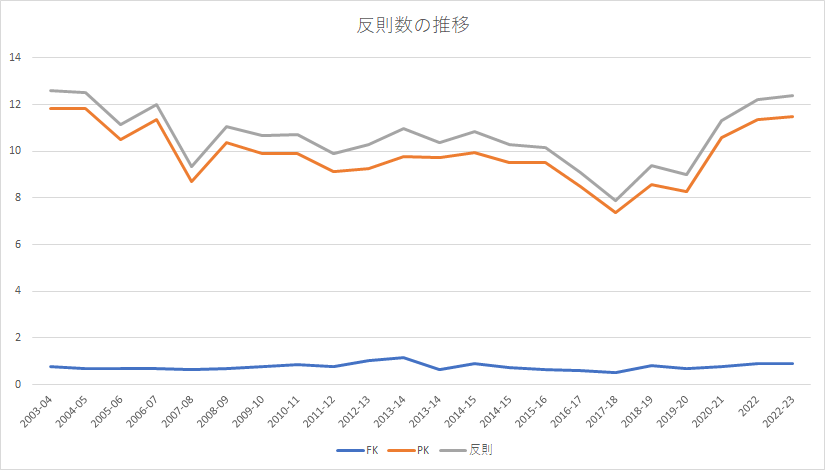 2017-18シーズンぐらいまでにかけて減少する傾向があったものの、近年はペナルティの数が増加しているといっていいだろう。