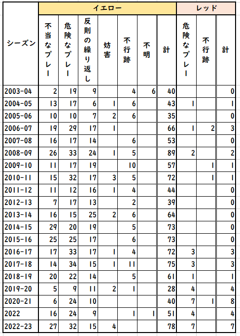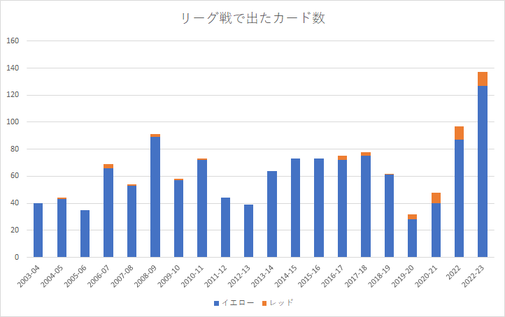 2022-23の合計は現時点(第13節まで)で、まだ3節+POが残っていることを考えると、前身のトップリーグ時代を含めても最もカードが出たシーズンとなることは確実なように思う。
