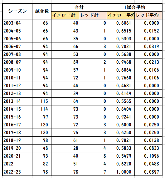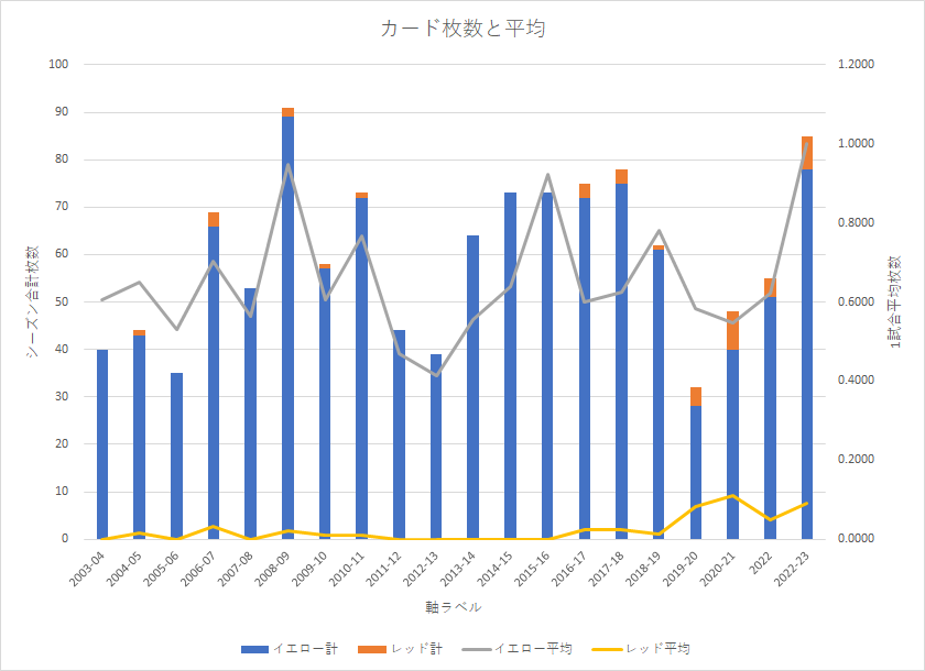 レッドカードはここ5シーズンぐらいが多く、それまではほぼ出なかったというイメージ。