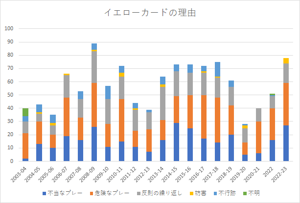 イエローの枚数は、1試合1枚に近付きその後落ちるのを繰り返しているので、今シーズンあたりがピークで、ひょっとしたらルールの理解が進むからか、来シーズンは落ちる可能性もあるのかもしれない。
