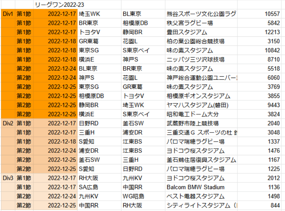個人的には、昨シーズンの序盤と今シーズンのスタートの傾向は似ていると思っており、春になりリーグ終盤にならないと、リーグワンの観客はそこまで入らないような気がしてしまっている。昨シーズンでは開催がなかった(中止になった)豊田スタジアムの2試合目が第3節にあり、そこの数値には注目できるかもしれない。