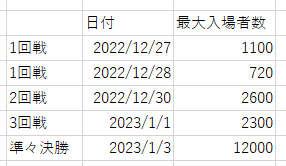 2回戦以降は2000人以上入る会場が現れ、準々決勝は1万人を超えている。