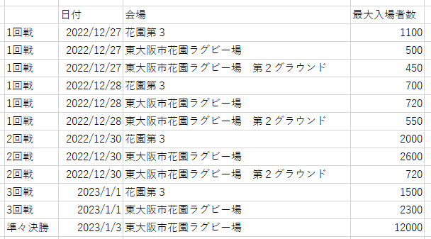 高校ラグビーのチケットの特性上、試合数が多く関係者が多いのもあってか準々決勝に昨年は最大を記録しているのでここまでの数値にはなるのだろうが、観客数で言うとトップカテゴリが高校生に負けるのだ。(準々決勝の第1試合の時点で9,800人であるから単純に比較すると3試合は高校ラグビーより入っているともいえるかもしれない)