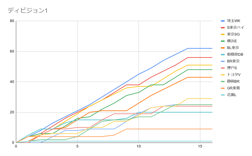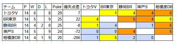得失点差で見てみると、トヨタVが+7、BR東京が+22、静岡BRが-8で比較的近いが、神戸S、相模原DBは大きくマイナス。トヨタVが入替戦対象となるのは、他4チームが勝ち点30に載せた時ぐらいが現実的か。