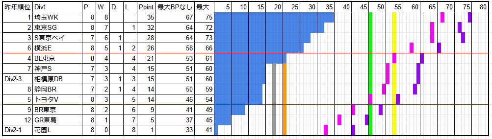 黄色ラインが昨シーズンのPO進出勝ち点、緑ラインが昨シーズン5位の勝ち点であることを踏まえると、GR東葛、花園Lはほぼ消滅、BPを含めないと超えないBR東京も薄いライン。現実的に、現状下位に沈んでいてシーズンも後半戦。入れ替え戦圏内となる下位3位争いがむしろターゲットか。