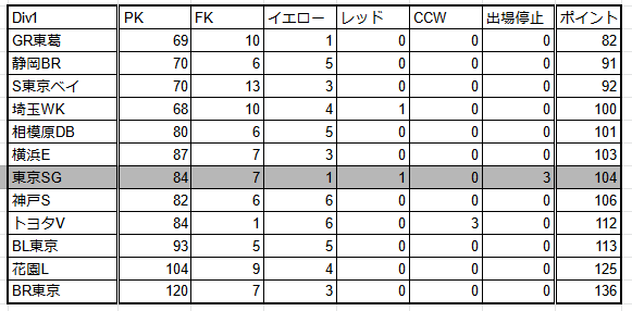 1試合で20は平気で動くので、何とも言えない。東京SGだけ出場停止があるのですでに除外。下位に沈むGR東葛が1番なのは面白い点かもしれない。反則を取られた数という統計でしかないので、ペナルティアドバンテージが出たけど、そのまま押し切られてアドバンテージが解消されると計上されないので、そのあたりが影響している可能性はある。
