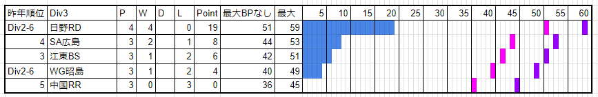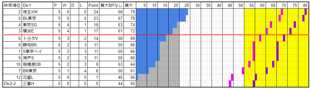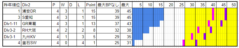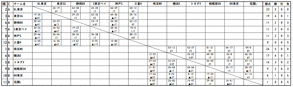 唯一の昇格組の三重Hは苦戦。花園も同様。1周目のチーム(現状の対戦したチーム)とはもう1回対戦があるわけでなかなかに厳しいところ。三重は全チームにBPを献上。花園も相模原線を除きBPを献上している。