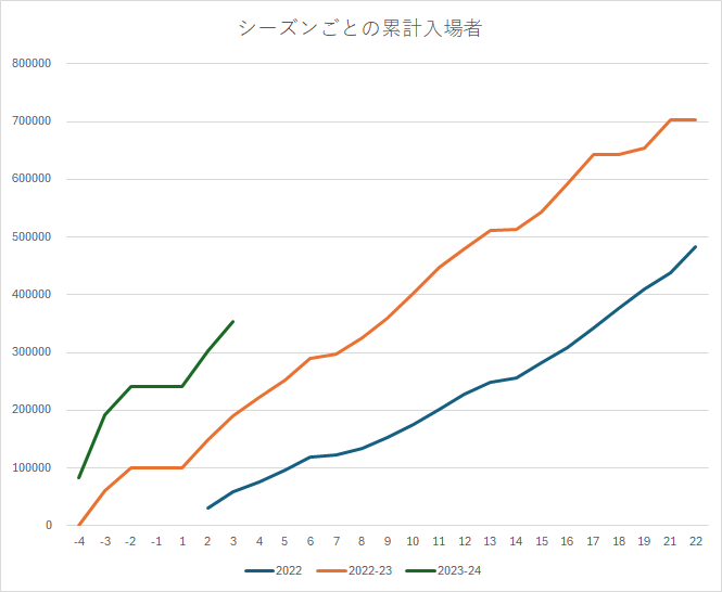開幕のタイミングに差があるとはいえ、現状は好調な滑り出し。といっても2022シーズンはコロナの規制真っただ中で、2022-23も緩和していくさなかであったのは言うまでもなく、かつ今シーズンはワールドカップ後のシーズンで、どのシーズンも正常値と見なすべきものではないとは思う。(2015-16シーズンは平均入場者数が+1700人、2019-20シーズンはリーグ戦の平均入場者数が+5700人)