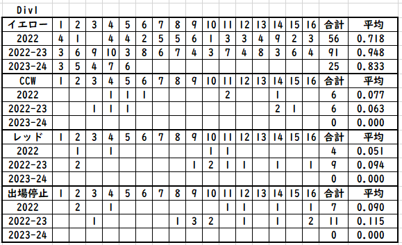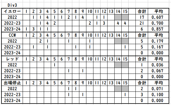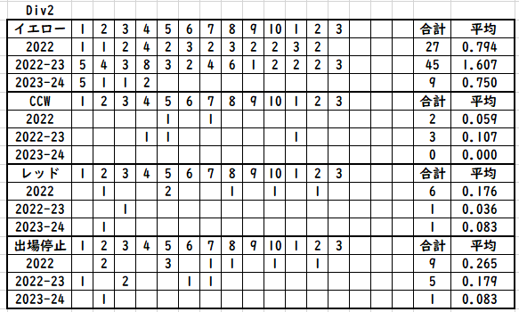 イエローの枚数は、Div2で半分ぐらいに減っているが去年が異常に多かっただけで、あんまり差はなさそう。今シーズンは現時点でCCWが1件もなく、出場停止も1件だけと重い罰則は少ない印象を受ける。