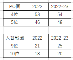 過去シーズンの入替戦圏内・PO圏内の勝ち点は以下の通り。