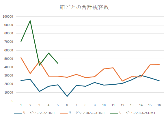 Div1の節ごとを見ると第2節がものすごく多い。第3節こそ昨シーズンより少ないが、結局どのキャパの会場で試合を行っているかに依存する側面はあるし、どういったイベントを打つのかにも関わってくる。