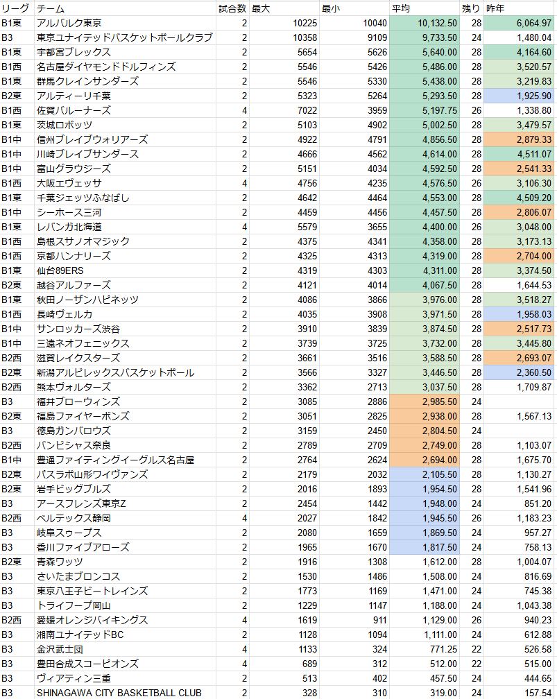上記表は、ホーム開催があったチーム。琉球、広島、横浜BC、神戸、福岡、鹿児島、横浜EX、山口、立川はまだ開催無し。