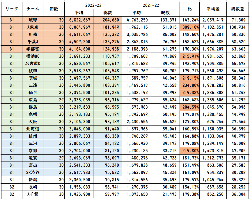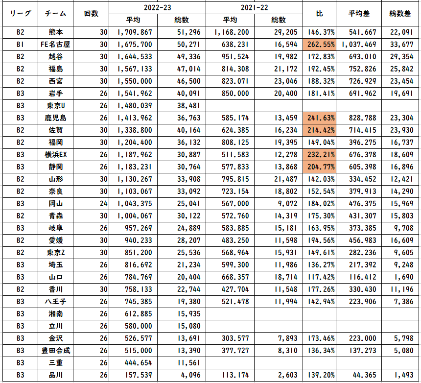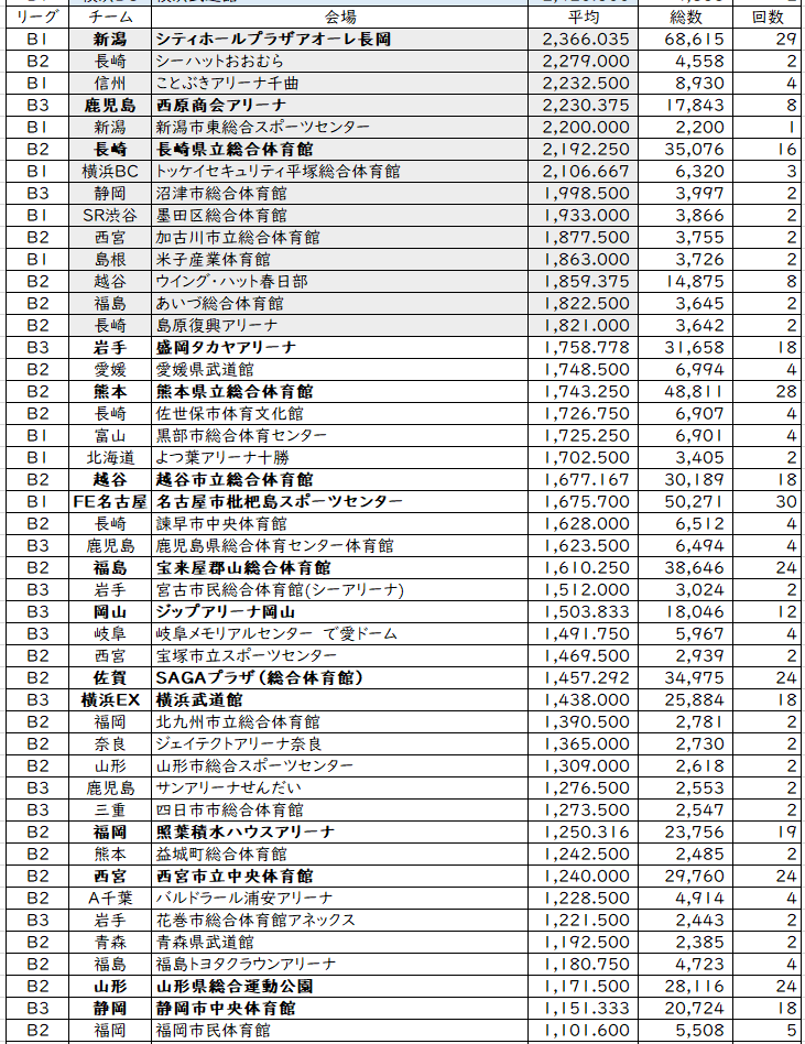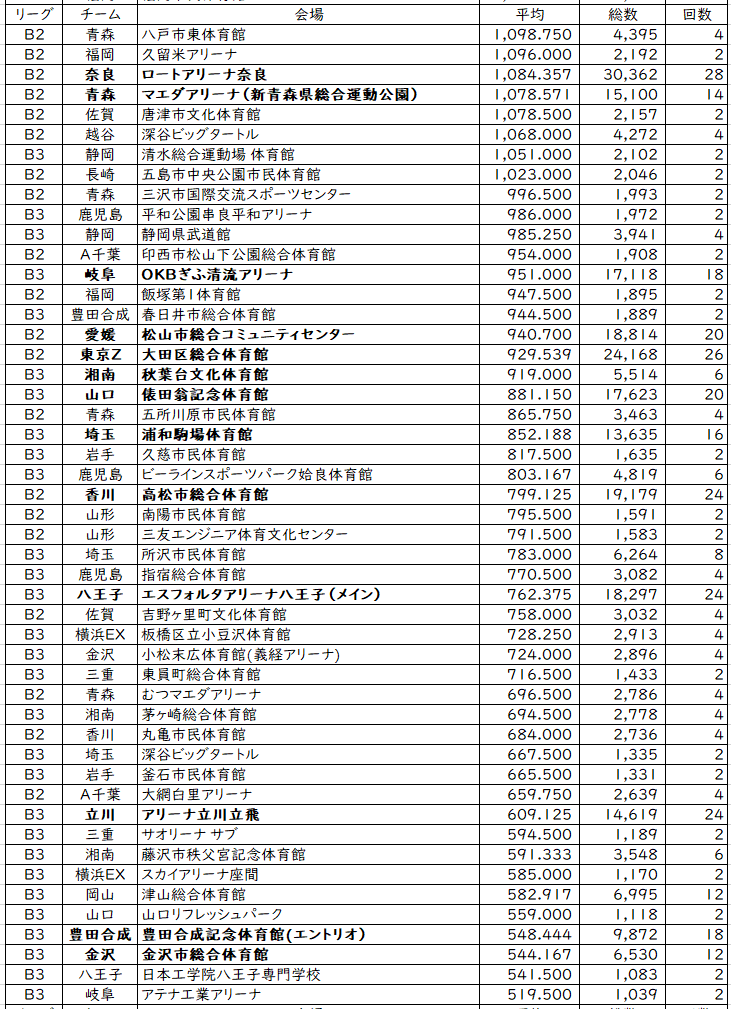 こうやって見てもFE名古屋が気になる。B1でありながらホームで新B2基準(2400名)すらクリアしていない。2026年秋開業の新アリーナ。新B1の開幕と同じタイミングでできるが、そもそも基準が達成できなければ、新B2、新B3にしか参戦できない。ライセンス基準が発表され、勝負が始まっているのに、すべての試合を枇杷島SCで行いこの数値なのは方向性が謎。