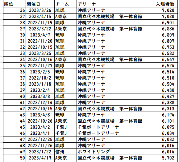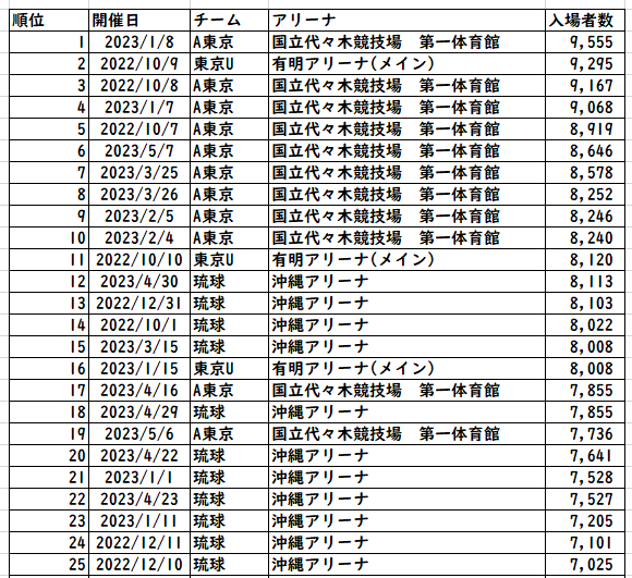 トップ40はほとんど同じチーム。A東京と琉球が大半を占め、東京Uが3試合入る。
