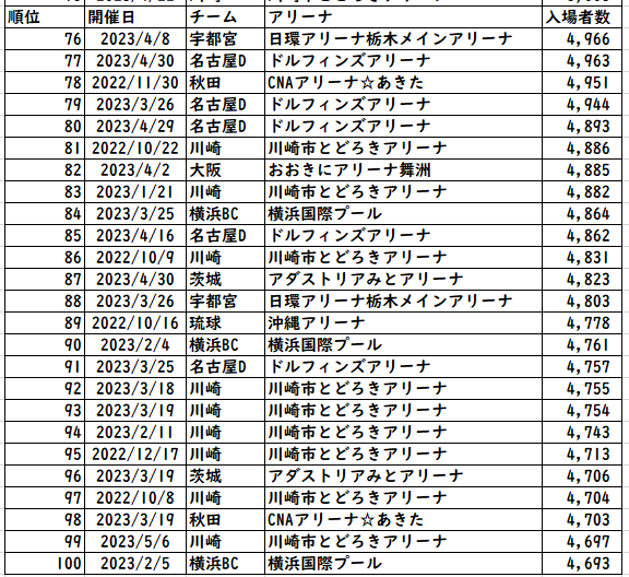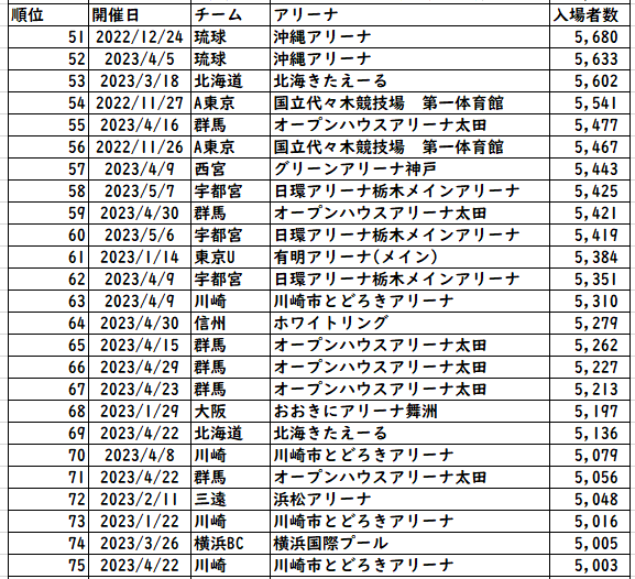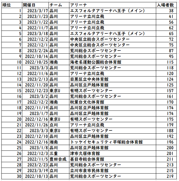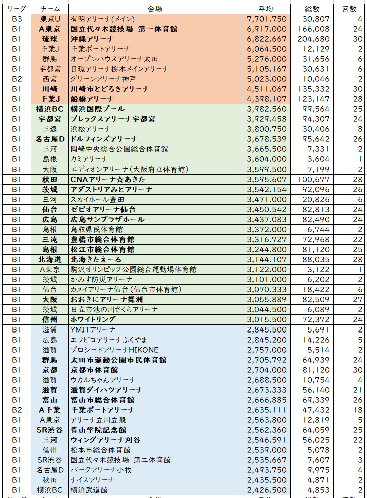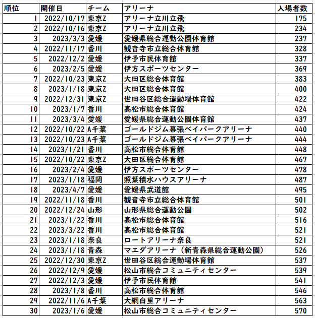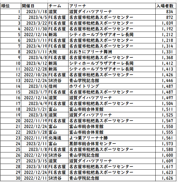 オープンハウスアリーナがすでに完成して使い始めている群馬は、来期増える余地が十分ありそう。POで使い始めたSAGAアリーナも興味深いところではあるが、そもそもの数値が少ないのでそれ以前の問題?