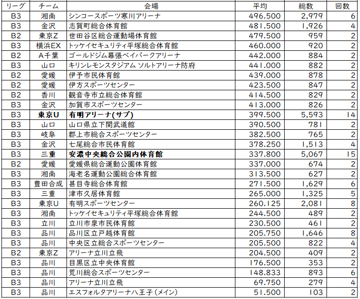 だいたい品川。100人未満はすべて品川。ホームアリーナが決まらないとそもそも新B3残留できないので、方向性が求められてきそう。