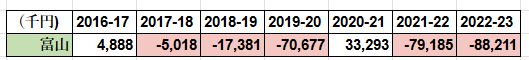 富山は昨シーズンから支出自体は減少しているが、それ以上に売り上げが減少。スポンサー収入こそ増えているが、入場者収入、物販収入、スクール、分配金と軒並み減少。