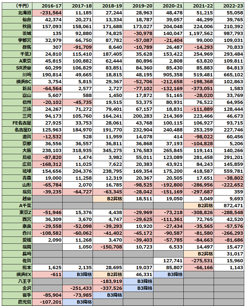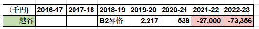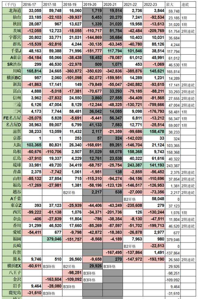 B1で最も赤字額が大きい。昨シーズンまでの川崎が4シーズン連続で約3.5億赤字を計上していたが、それの倍近い約7.6億円の赤字。