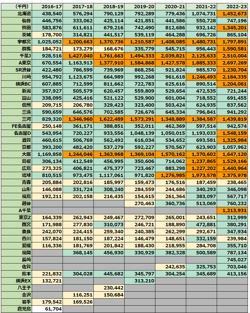 1億円未達チームはなし。3億円未達は青森と香川。現状規定だとあまり影響はなさそう。