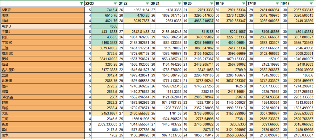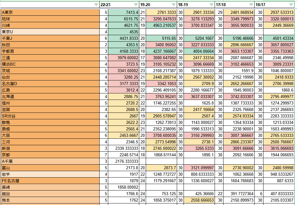 ただ、4次審査までいって3,000人に緩めて新B1が成立したとすると、新B2になりうるチームがそこまでいなくなりそうなのが少し怪しいところ。現状今シーズンが黄色のチームが7チームで、ボーダー近辺(2,000人以上)にあと5チームぐらいいると考えても、過去のシーズンを見てみるとそこまで決して良い数値ではない。