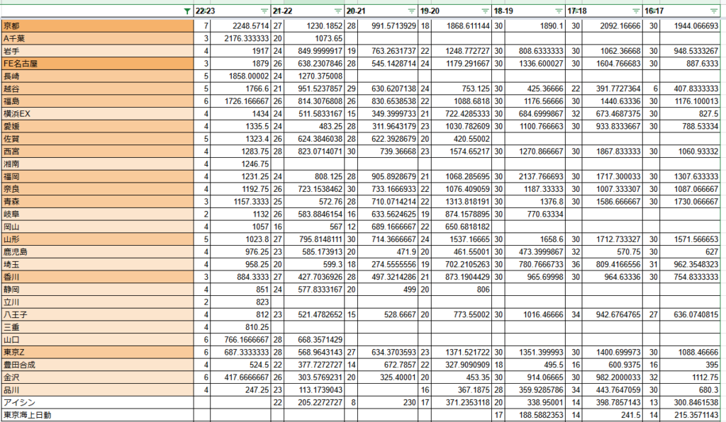 コロナの影響をうけた20-21、21-22シーズンは基本的に半減していると考えるべきで、あまり優位性のあるデータではないだろう。今シーズンになってからコロナ前のシーズンより明確に伸びているチームを見ていこう。