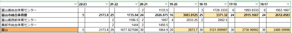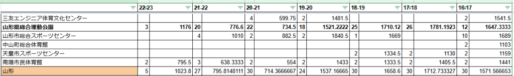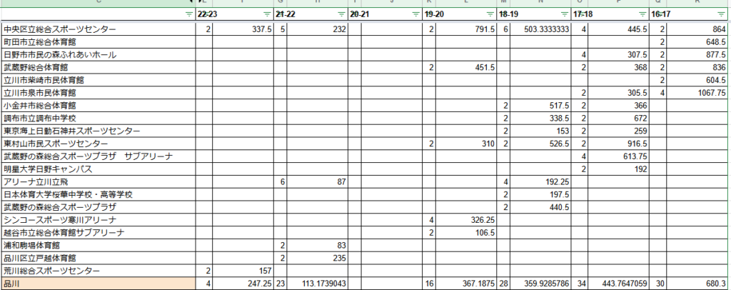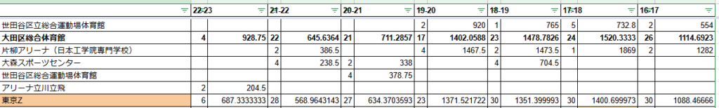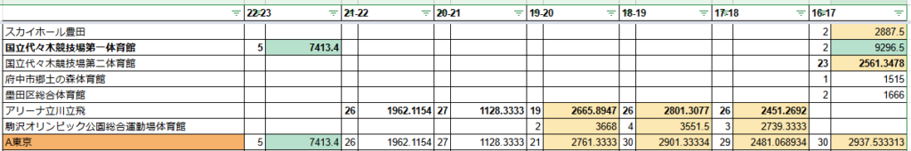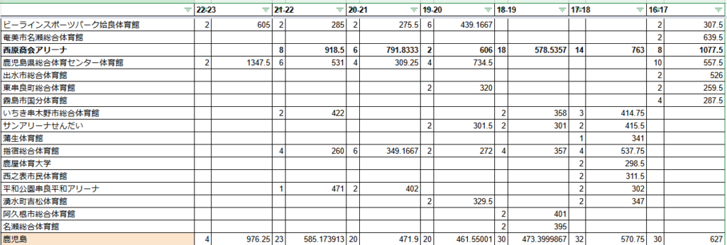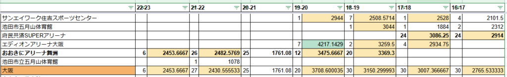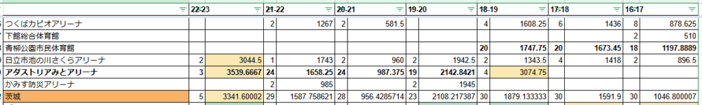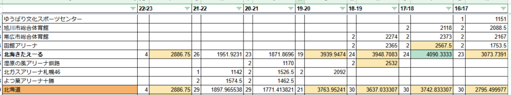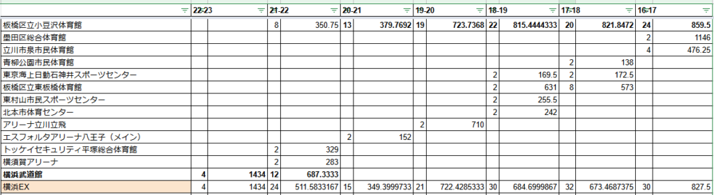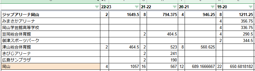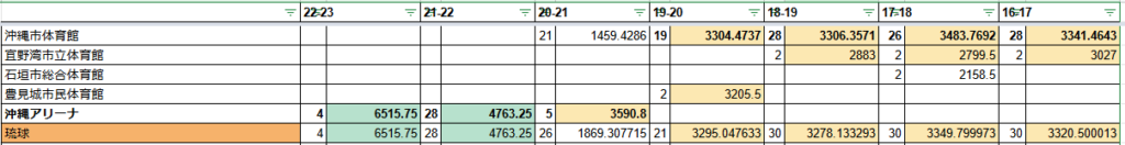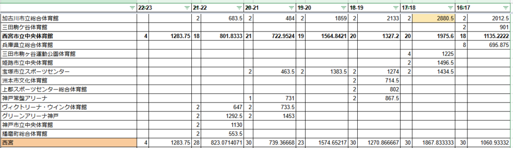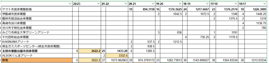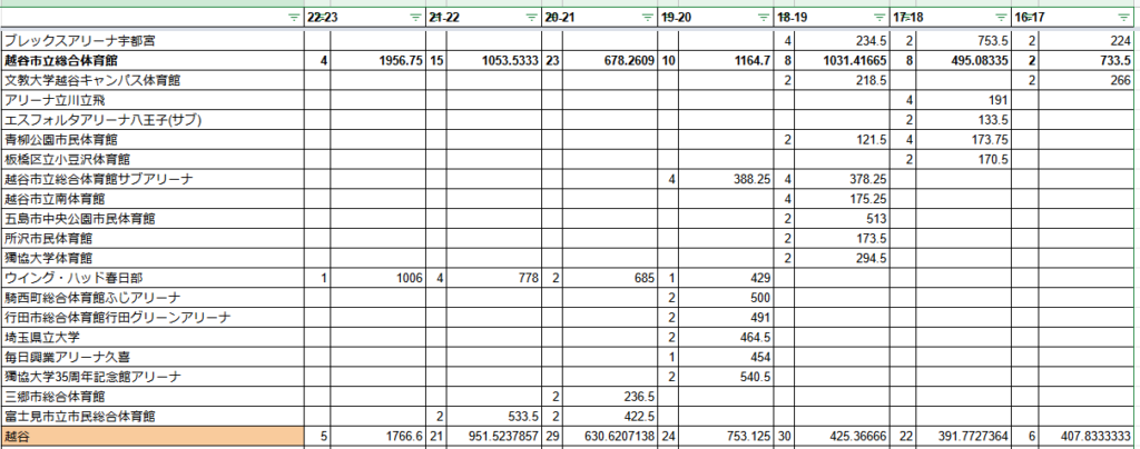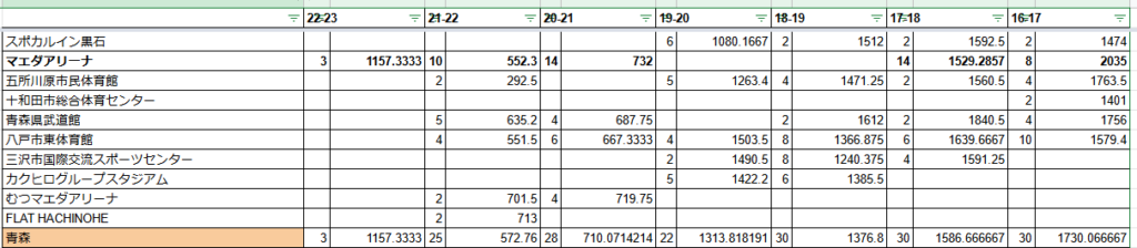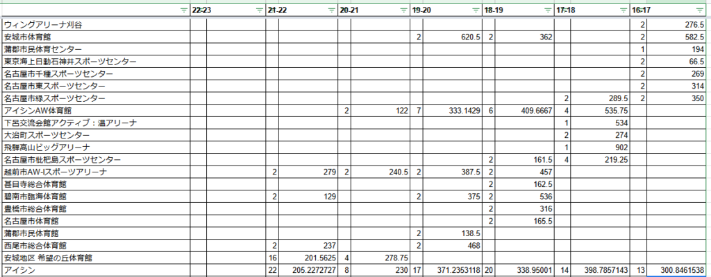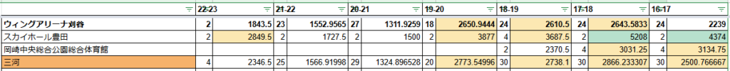 ホームアリーナのウィングアリーナ刈谷よりもスカイホール豊田のほうがいずれの年も入っているのは面白い点。試合数が多い場所は平日開催もあるので多少は少ない試合があるので仕方ないとはいえ、その分土日に入るので他のチームはプラマイゼロぐらいにはなっているようなきがする。2試合開催だとほぼ確実に土日ですしね。とはいえ、そもそも隣接都市なので。。。