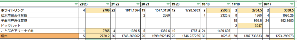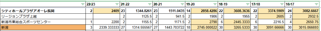 今シーズンは、長野市のホワイトリングもことぶきアリーナ千曲も試合数がまだ少ないとはいえ同じぐらいの人数が入っている。というか、B2時代はホワイトリンクをメインで使ったともみえる19-20シーズンは入ってない。それ以前は2試合で土日だったから多かっただけ?