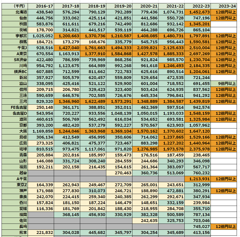 昨年度決算までと比較すると8億円以上増えているチームもあり興味深い。といっても神戸は2021年にスマートバリューの子会社になって3年目で、プレミアを狙うタイミングでの広告費倍増は十分あり得そう。その他、仙台、長崎、富山あたりが比較的伸ばしているといえそう。仙台は23年11月に、霞ヶ関キャピタルが買収・連結子会社化しており、長崎はジャパネット系のチーム。おそらく富山が一番ギリギリなチームで、過去決算を見ても8シーズン中5シーズンが赤字であったりするなか、B2降格してしまったが、どう維持していくかは課題がありそう。