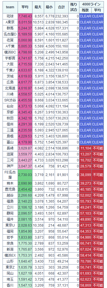 といったところを踏まえると、最低9チーム。あとは静岡は売り上げはクリア。他チームは少し調べただけでは「B ONEを目指す」ぐらいのコメントしか見つからなかった。10~19チームぐらいがB ONEとなるか。