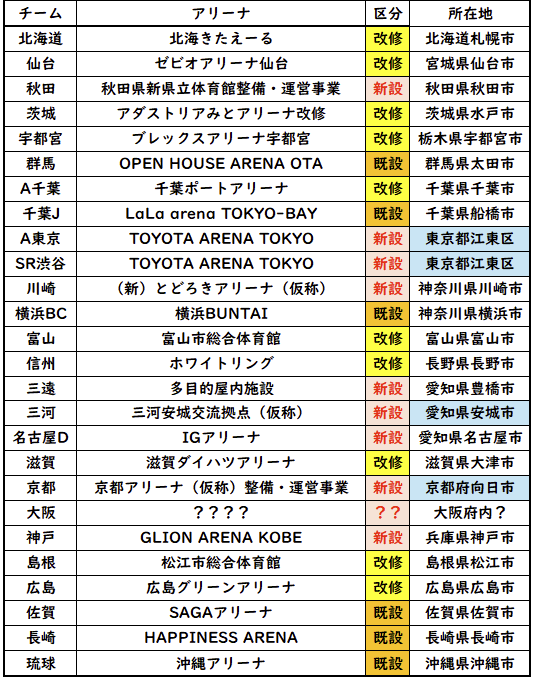 サプライズ的なところで言うと、事前発表されていた通りSR渋谷のTOTOTA ARENA共同利用か。といっても9か月(9月から5月末)で89日以上確保せよ、なので2チームまでは成り立ちうるのもまた事実である。(その意味で行くとFE名古屋も県体育館共同利用という未来はあったはずだが……)