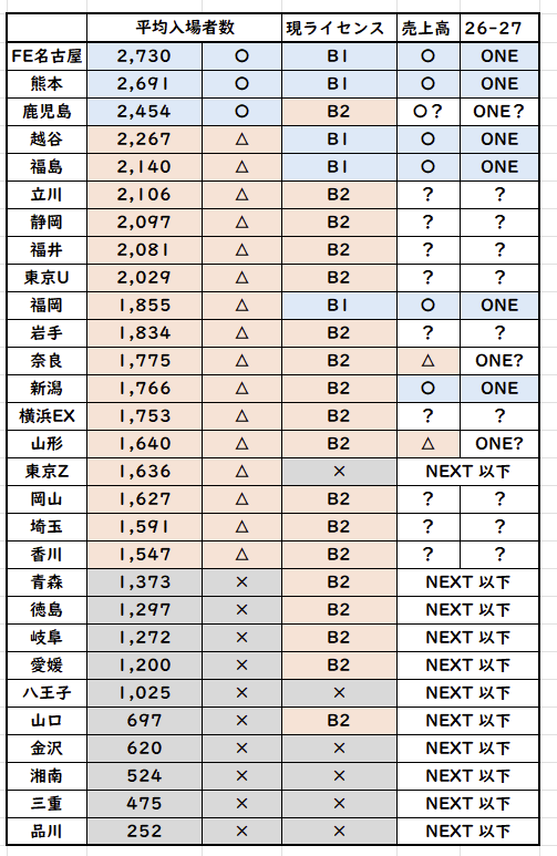 それらを踏まえてみると、FE名古屋、熊本はほぼONE確定。鹿児島もクリアしていそうな雰囲気。仮ライセンスを見ると、越谷、福島、福岡、新潟あたりは売上高4億円以上は達成していたことはあり、資金繰りさえ安定していれば問題ないか。奈良、山形あたりは成長できていればクリアしている余地もありそう。