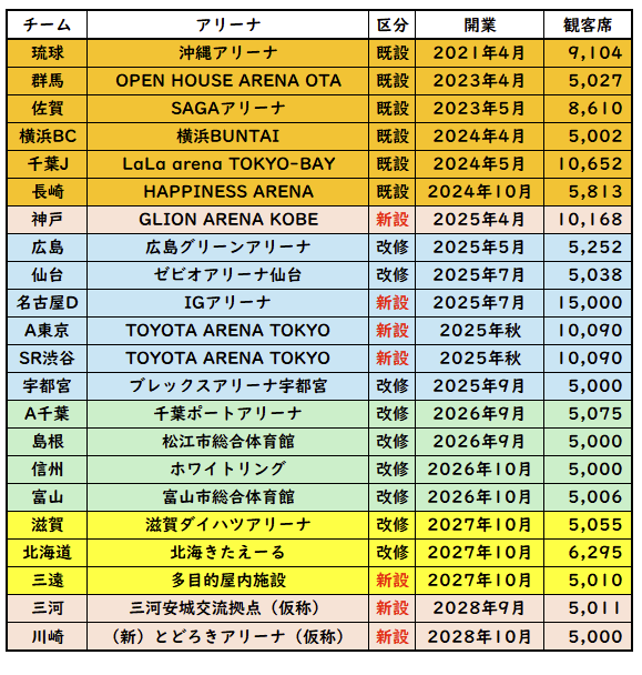 改修予定のチームは、どの程度の期間を改修に当てる計画なのか、にもよるが予定が近いほどどうするのかは明確になっているとみてよいだろう。ライセンスが出ているのでどのチームも計画が適切であると認められている一方で、後であるというのは様々なリスクがあるのは否めない。滋賀は、26-27シーズン後に回収を着手する予定で、きたえーるは2026年以降。もちろんすぐに工事ができるものではないから遅いわけではないが、少し計画が狂うだけで間に合わない余地は否めない。