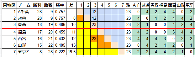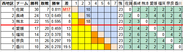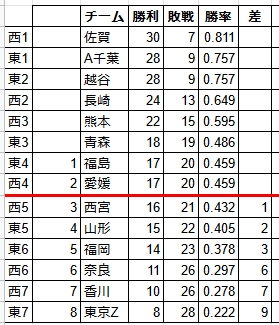 東地区の3位争い4チームと、西地区の愛媛、西宮でワイルドカードを争う形か。