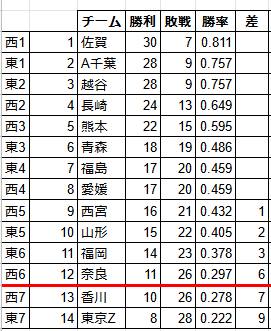 今までのシーズンと比較すると、フォーマットがコロコロ変わっているので単純比較はできないが15勝以下が下位2チームのライン。現状8勝の東京Zを筆頭に、香川、奈良あたりが怪しいラインか。