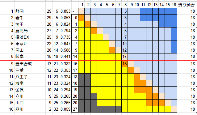 静岡、岩手、埼玉、鹿児島、横浜EXまではほぼ決まりとみてよいように思う。次ぐ東京U、岡山も比較的有利な位置にいるといってもよいだろう。