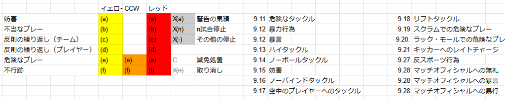 となっている。つまりAは大会中に3回(セブンスシリーズは5回)のイエロー/CCWを受けた選手に関する規定、Bは1試合で2回のイエロー/CCWを受けた選手に対する規定である。しかし、リーグワンはすべてにおいて、附属文書4のB.2を引用している。